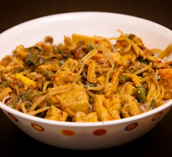 米粉、鸡肉丝、鸡蛋、鱼饼、虾、豆角、豆泡和豆芽、海米、干辣椒末、洋葱、鲜黄姜、叻沙叶、桂皮、香茅草、丁香、柠檬、鲜南姜、椰浆