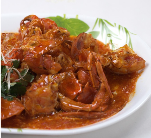 ②炸好螃蟹之后另起锅,放入少许油,炒制辣椒酱、如果选用两只打个的斯里兰卡螃蟹,就需要一大碗辣椒酱才能炒出口味浓郁的正宗辣椒螃蟹。继续加水,等大火烧开辣椒酱之后,将炸好的螃蟹放入锅中炖煮,再转小火令汤汁煮干,让汤汁全部被螃蟹吸收,还要放一些老抽令其上色。炖煮螃蟹时还要放入少许盐、白砂糖、胡椒和鸡粉、辣椒酱里也有调味料,所以盐应少放,白砂糖的加入可以让螃蟹更加鲜美。