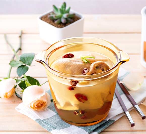 3.1.2L养生炖盅内依次放入乳鸽、淮山、枸杞子、沙参、玉竹、芡实、红枣,注入清水,水位至炖盅2/3处,盖上盖子。