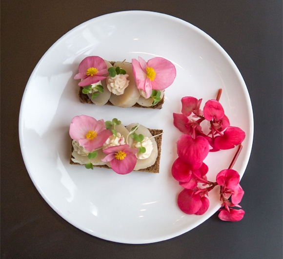 新鲜鲜贝 3个、新鲜海棠花 5朵、花菜 200g、酸奶油 100g、奶油 200g、黑麦面包 1个