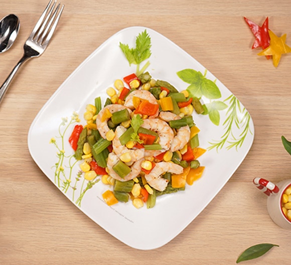 4、彩椒、芹菜、芦笋等蔬菜一起拌匀,大虾摆开;