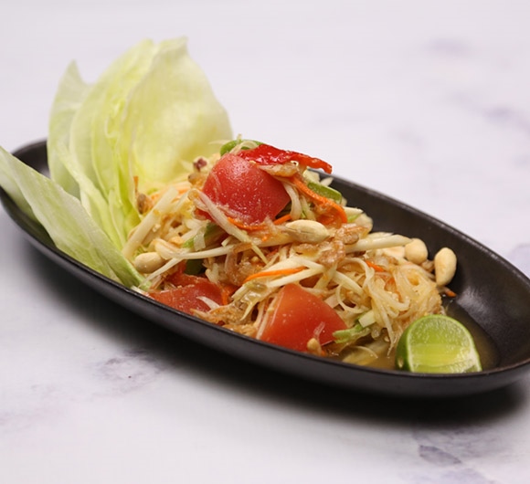 青木瓜刨丝,胡萝卜切丝,加入以上配料,酱汁,新鲜柠檬拌匀,装盘,香菜点缀,即可。