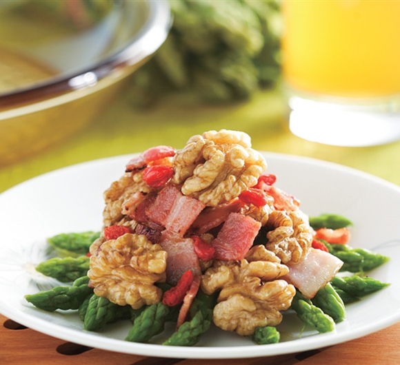 3 锅内放少许黄油炒香培根、香葱、核桃仁,加少许盐、鸡精、蚝油调味,放入枸杞浇在芦笋上即可。