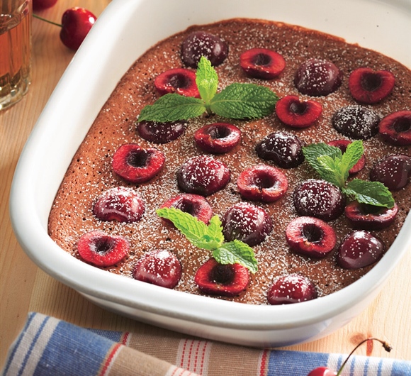 5 烤箱预热170℃, 烤30-35 分钟,脱模冷却,用樱桃装饰,撒上糖粉。
