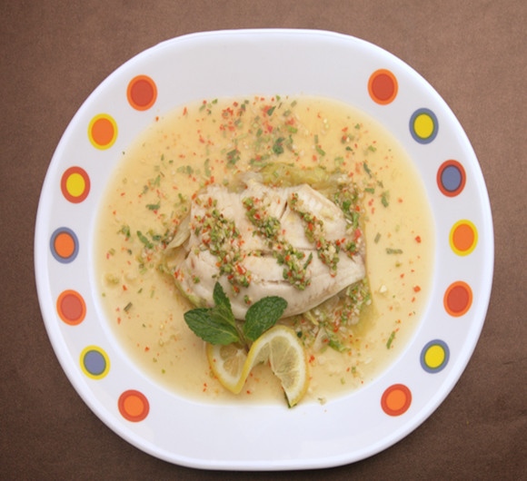 鲈鱼、大蒜、辣椒、姜香菜、青柠檬