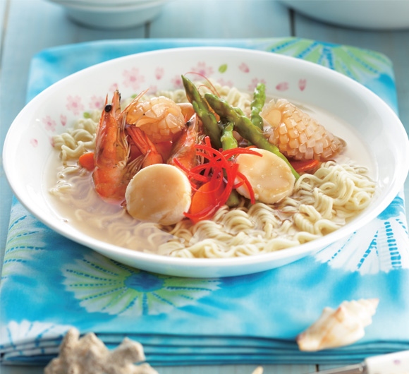 4 将面条捞出放入盘底,康宁锅中放油煸香葱、姜、蒜,放入蚝油煸香,再放入胡萝卜片煸炒,下入北极虾、鱿鱼卷,加入少许热水,调入盐、糖、生抽、鸡精后勾芡。将鲜贝、芦笋倒入面盘中,撒香葱末、红椒丝即可。