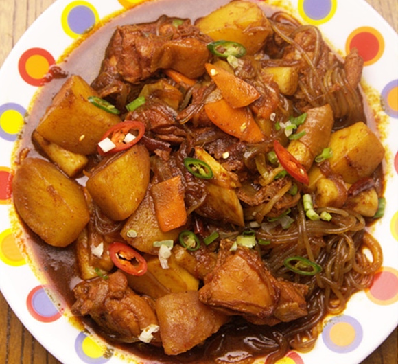 ⑤这时再加入胡萝卜、土豆、洋葱等蔬菜,开始炖煮。之前干辣椒炒出来的辣味只能停留在表面,鸡肉要想真正入味还需要慢炖。慢炖20分钟之后,热气腾腾的