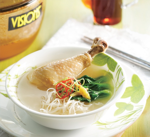 3 搭配上蔬菜和泡椒,再放入适量盐和鸡精调味,美味的鸡汤米线就做好了。