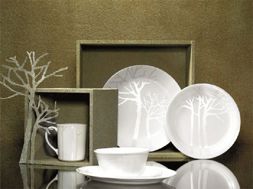 在秋冬交替的季节,美国康宁餐具"金色系列"推出了一款应景的新花色产品----『树影』。它用特制的月光银,呈现挺拔的树干和枝叶,使整套餐具 显得洁白大方,素雅高贵。此外,『树影』系列也继续沿袭着康宁玻璃餐具轻薄耐用的品质,使您冬季的餐桌体验"碗"美感受。