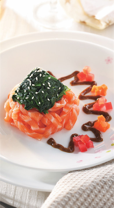 4 挤在三文鱼垫底的菠菜堆旁,撒熟芝麻和西红柿丁即可。