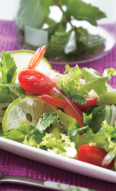 3 洋葱切成长条状,接着将薄荷叶撕成小片放在奇异果和洋葱中。最后淋上酱汁调味即可。