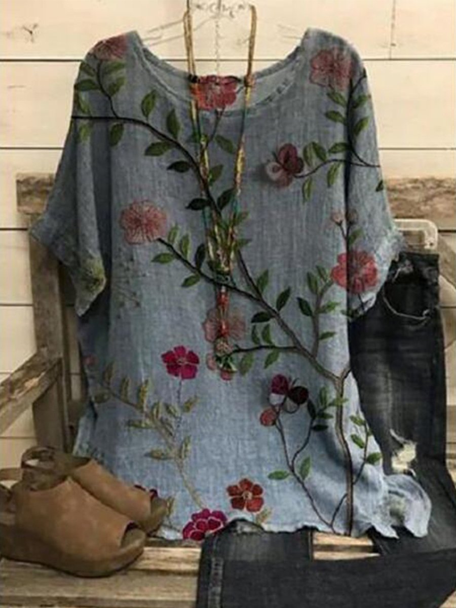 Ladies Floral Print Loose Cotton&Linen T-Shirt
