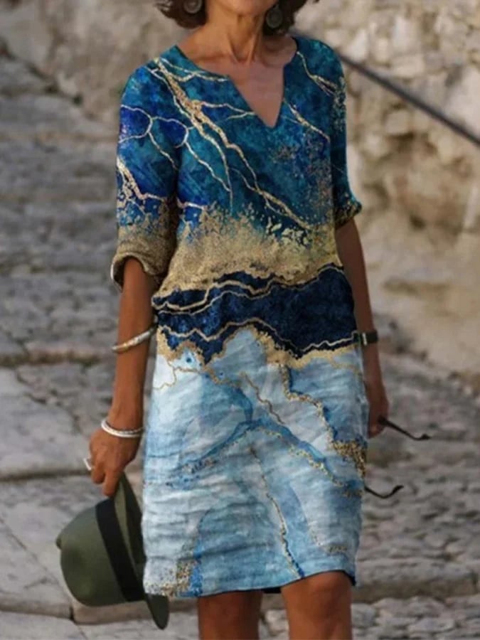 Women's Cotton Linen Marbled Foil Print V-Neck Shift Dress