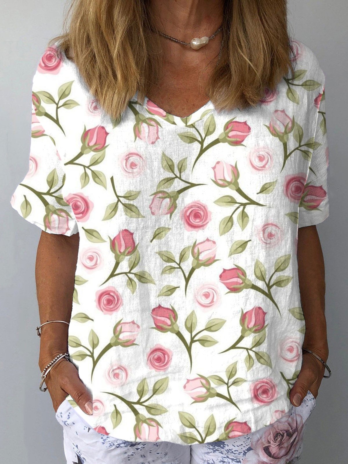 Women's Floral Casual V-Neck Cotton And Linen Top