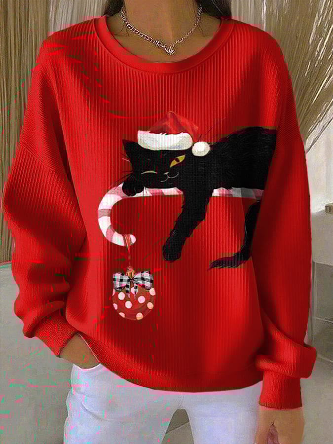 Women's Retro Christmas Cat Print Round Neck Sweatshirt