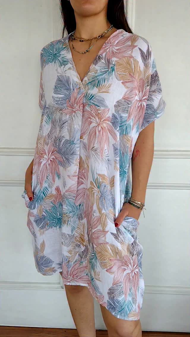 Women's Seaside Resort Floral Tree Pattern Short-Sleeved Cotton And Linen Dress